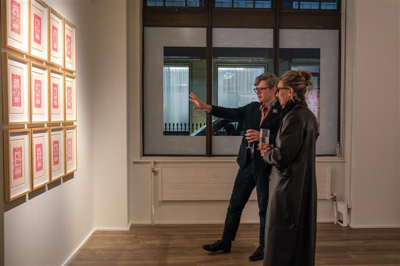 Rory Hutton and Guest at the opening of his exhibition ‘Gardening in Linocut’ (2023) at Shapero Modern Gallery.