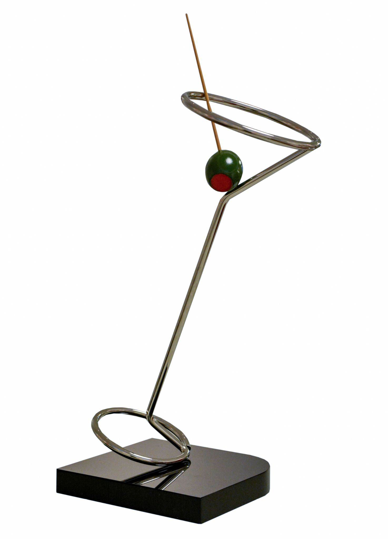 Oldenburg envisioned choreography for an opulent table setting with sixty-five twirling cocktails, but this never materialized. Instead he created Tilting Neon Cocktail, a stainless steel, cast aluminium, acrylic paint and Plexiglass sculpture in 1983. It was inspired by his time in San Francisco in 1954 where he noticed that neon signs of that shape identified cocktail bars.